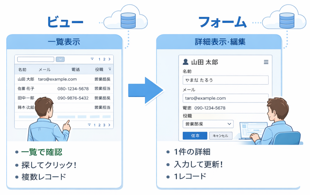 | 表示 | 画面上部のステージバー | フォーム内の自動制御 |